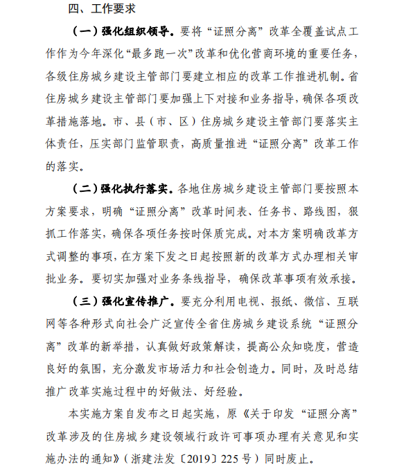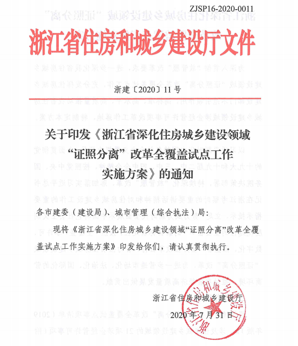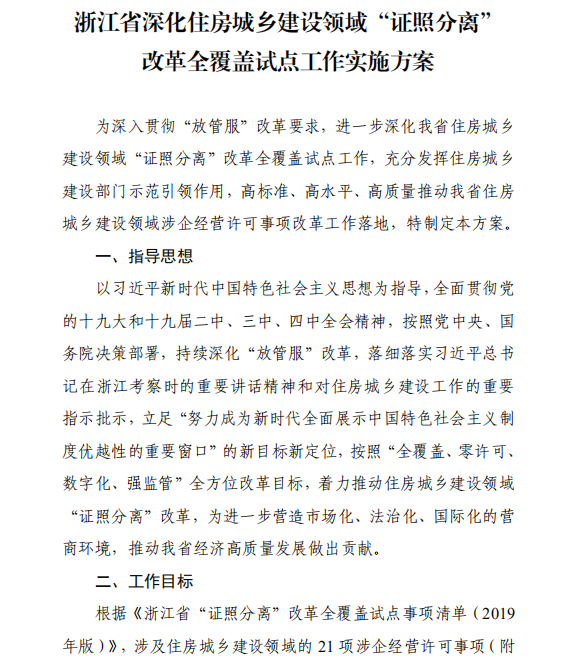 8月11日,浙江省住建廳印發《浙江省深化住房城鄉建設領域“證照分離”改革全覆蓋試點工作實施方案》。