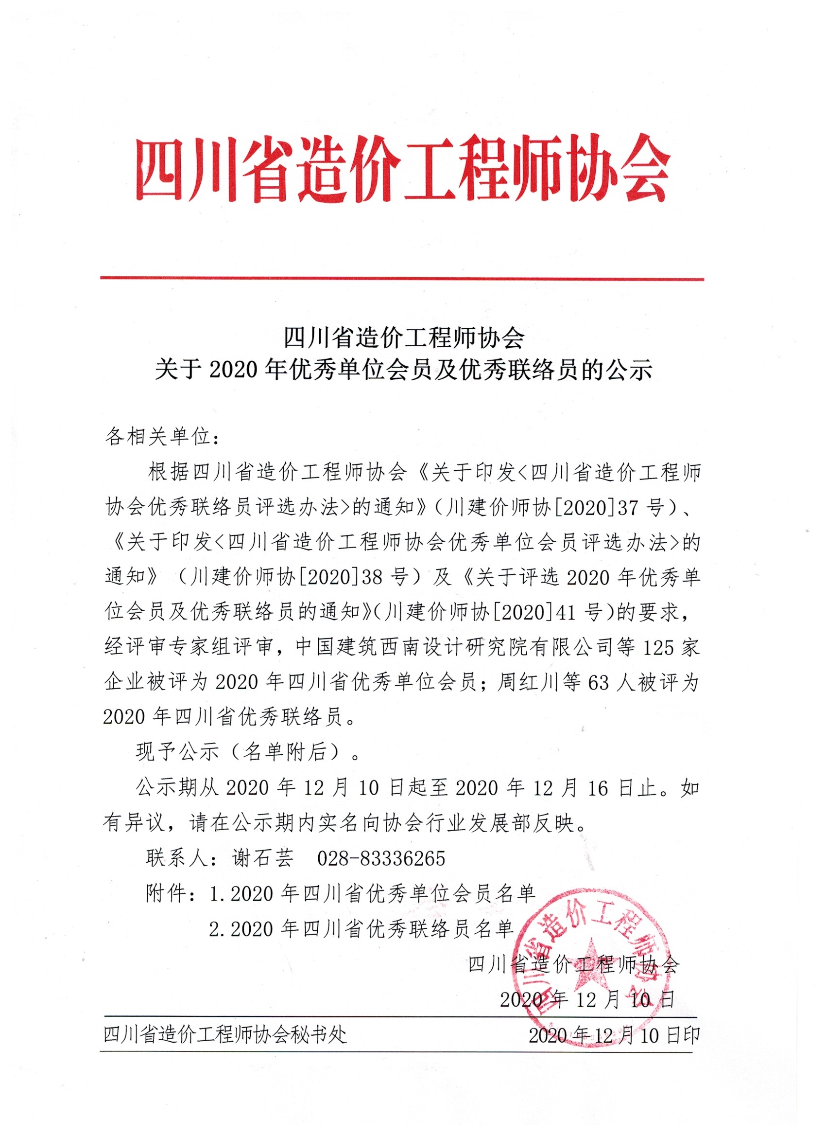 轉發“四川省造價工程師協會《關于2020年優秀單位會員及優秀聯絡員的公示》”