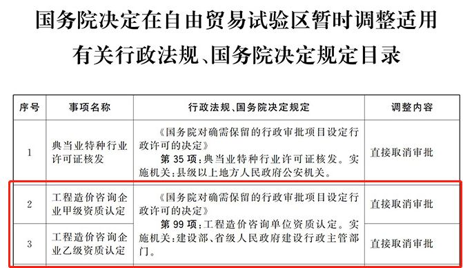 2019年11月15日,國發〔2019〕25號《國務院關于在自由貿易試驗區開展“證照分離”改革全覆蓋試點的通知》中提到在試點區域直接取消工程造價咨詢企業甲級、乙級資質認定。